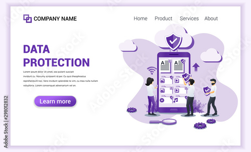The watermark will not be included on Sticker.: Modern flat design concept of data protection with characters people protecting data on giant phone -