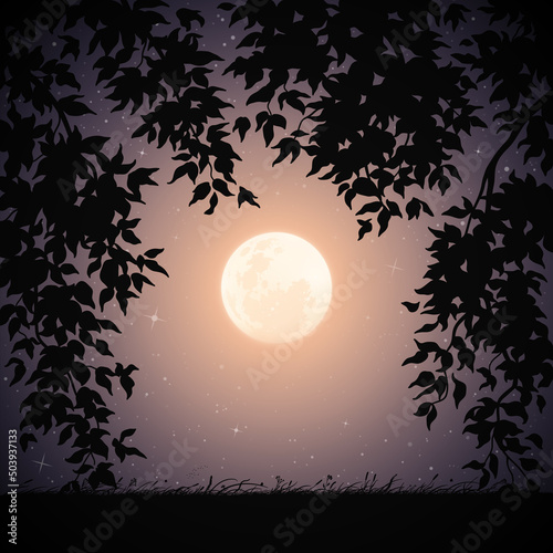 Sticker moon framed by branches. landscape with tall grass on starry night
