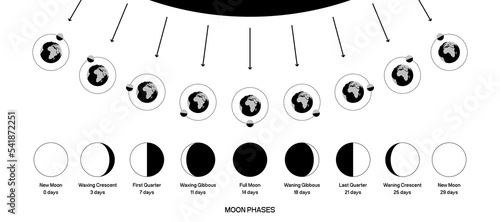 The watermark will not be included on Sticker.: Moon phases scheme sphere shadow cycle astronomy icon set - vector illustration background
