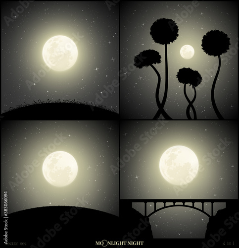 The watermark will not be included on Sticker.: Moonlight landscapes - full moon in night starry sky - black white set