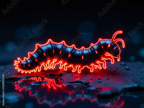 Sticker neon a glowing red and black bug is lit up in a dark room. the bug is surrounded by a dark backgroun