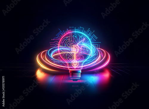 Sticker : Neon light bulb with a circuit pattern and vibrant rings creates a double exposure effect on a dark