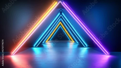 The watermark will not be included on Sticker.: Neon light tunnel with colorful glowing triangle frames and vibrant reflections in dark space creati