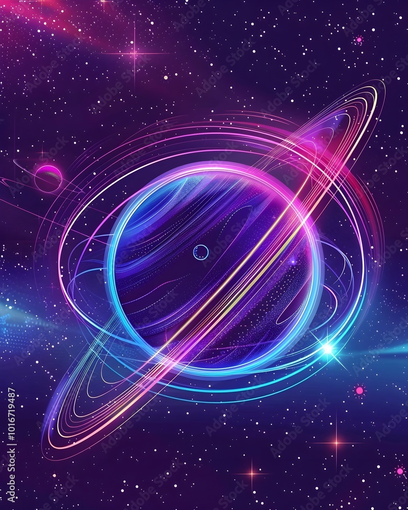 Sticker neon of orbiting space station around glowing planet with cosmic rays and stars in background - Stickers Sticker neon of orbiting space station around glowing planet with cosmic rays and stars in background - Stickers