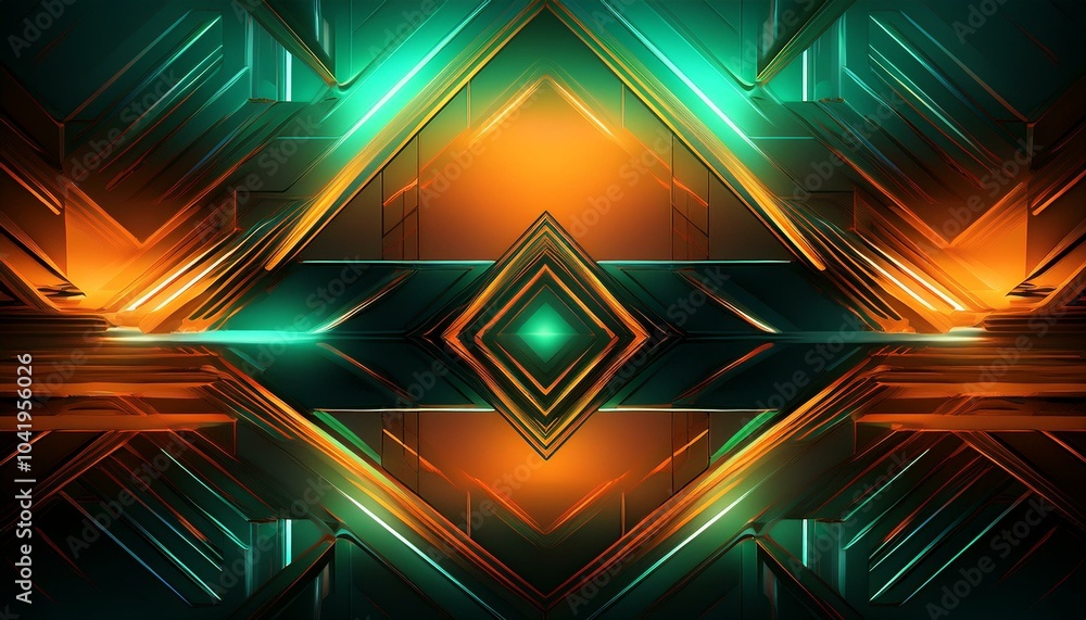 The watermark will not be included on Sticker.: Orange and green neon geometric pattern background with a mirrored reflection background green mirro