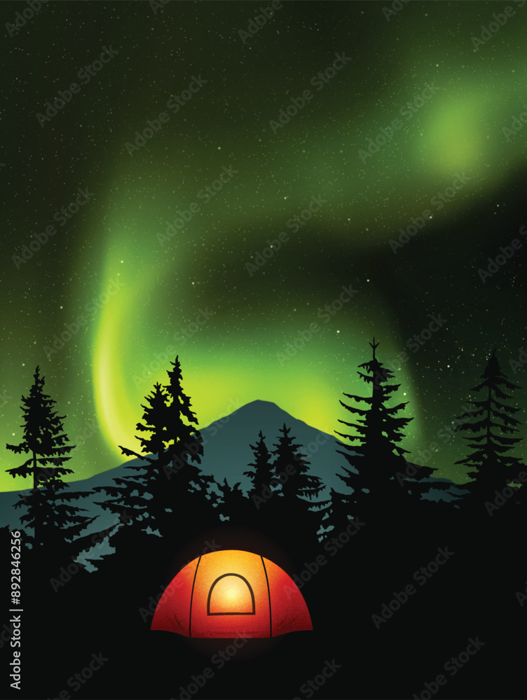 Sticker orange tent on meadow under tree. camping at night. green polar lights