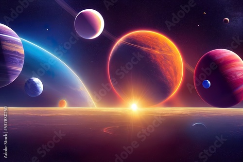 Sticker : Panoramic view of planets in distant solar system in space 3d rendering