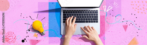Sticker : Person using a laptop computer and a light bulb - flat lay