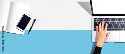 The watermark will not be included on Sticker.: Person using a laptop computer from above