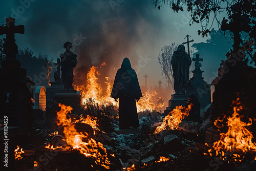 The watermark will not be included on Sticker.: Picture of a scary person ghost burning at hell afterlife generative ai technology