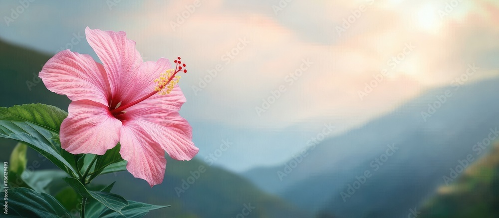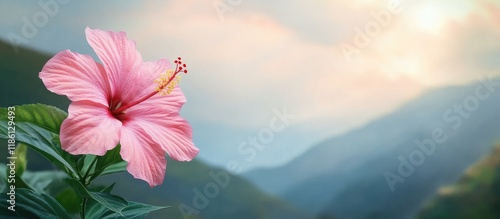 Pink hibiscus flower on the mountain soft focus - with copy space image - place for adding text or desSticker