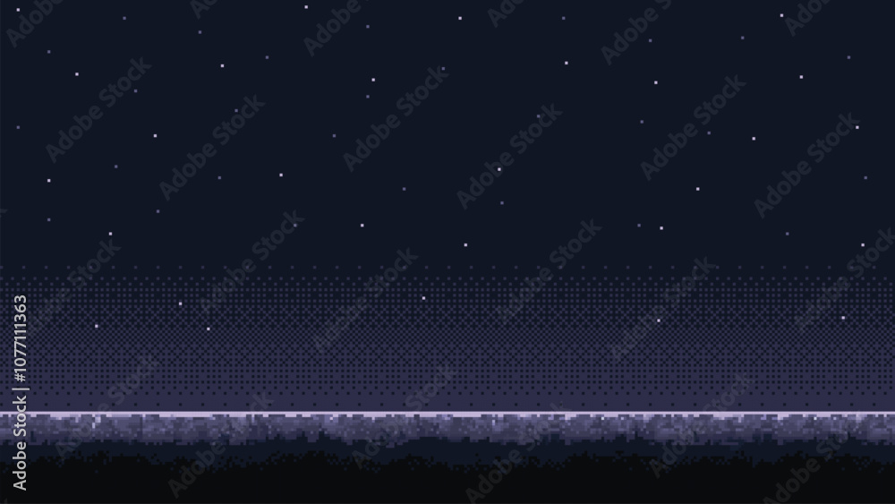 The watermark will not be included on Sticker.: Pixel art space game level background, 8 bit retro style video game - planet surface - starry sky - vec