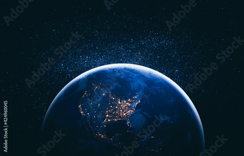 Sticker : Planet earth globe view from space showing realistic earth surface and world map as in outer space p