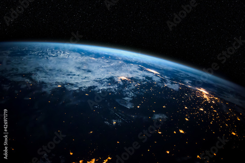 Sticker : Planet earth globe view from space showing realistic earth surface and world map as in outer space p