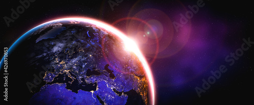 Sticker : Planet earth globe view from space showing realistic earth surface and world map as in outer space p