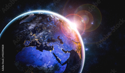 Sticker : Planet earth globe view from space showing realistic earth surface and world map as in outer space p