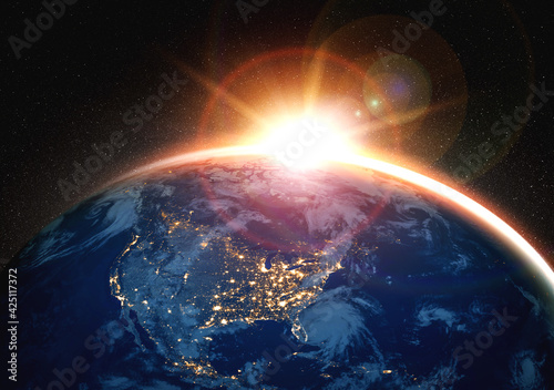 Sticker : Planet earth globe view from space showing realistic earth surface and world map as in outer space p