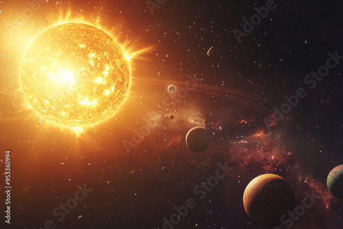 The watermark will not be included on Sticker.: Planets are orbiting massive star in deep space - planetary system and glowing star