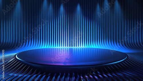 Podium in the middle of abstract blue color gradient background with sound waves, sound wave, audio Sticker