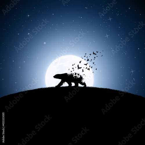 Sticker polar bear on moonlight night. endangered animal. death and afterlife