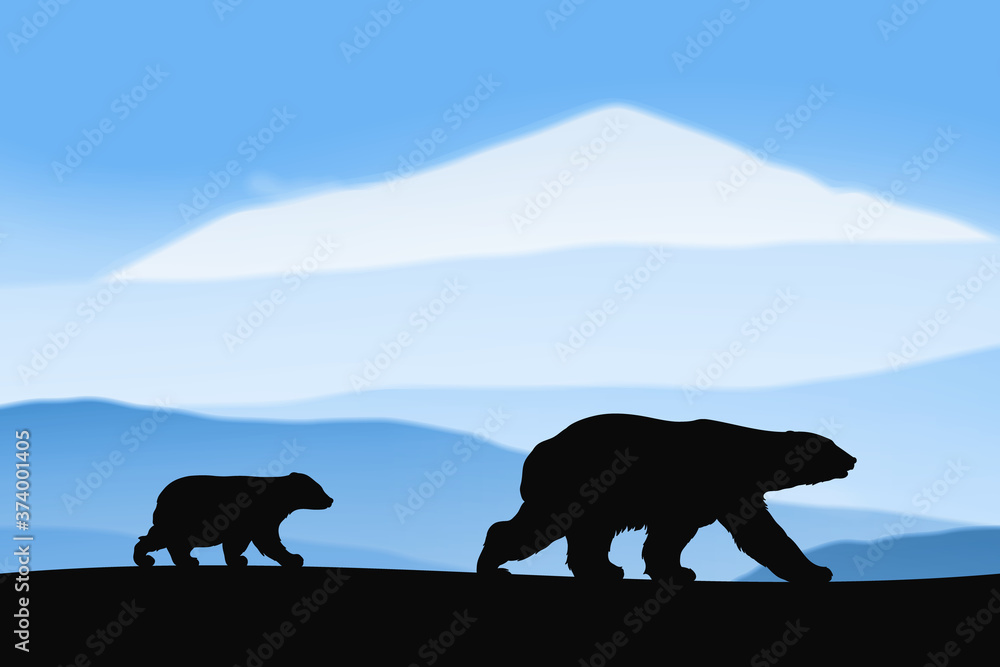 Sticker polar bears walking in snow. animal silhouettes in foggy mountains