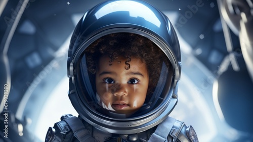 The watermark will not be included on Sticker.: Portrait of a astronaut child with the spacesuit and helmet in the spaceship background -