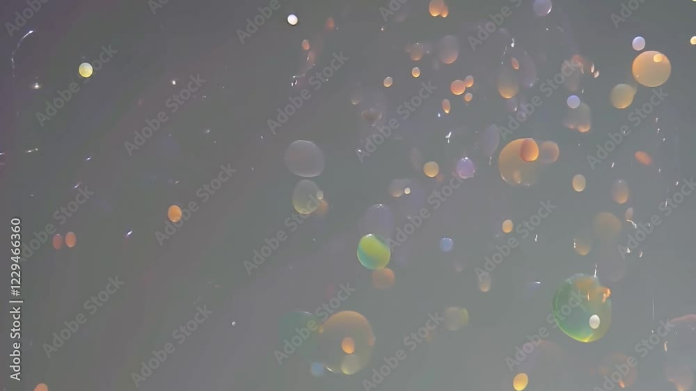 Present a macro shot of water and oil interacting with floating gradient shapes, such as ovals and sSticker