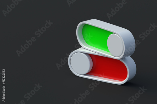 The watermark will not be included on Sticker.: Red and green toggle switches on black background - modern on, off button - user interface elements - c