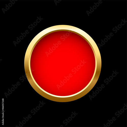 Sticker : Red button in round gold frame, 3d shiny metal golden circle on green push click button