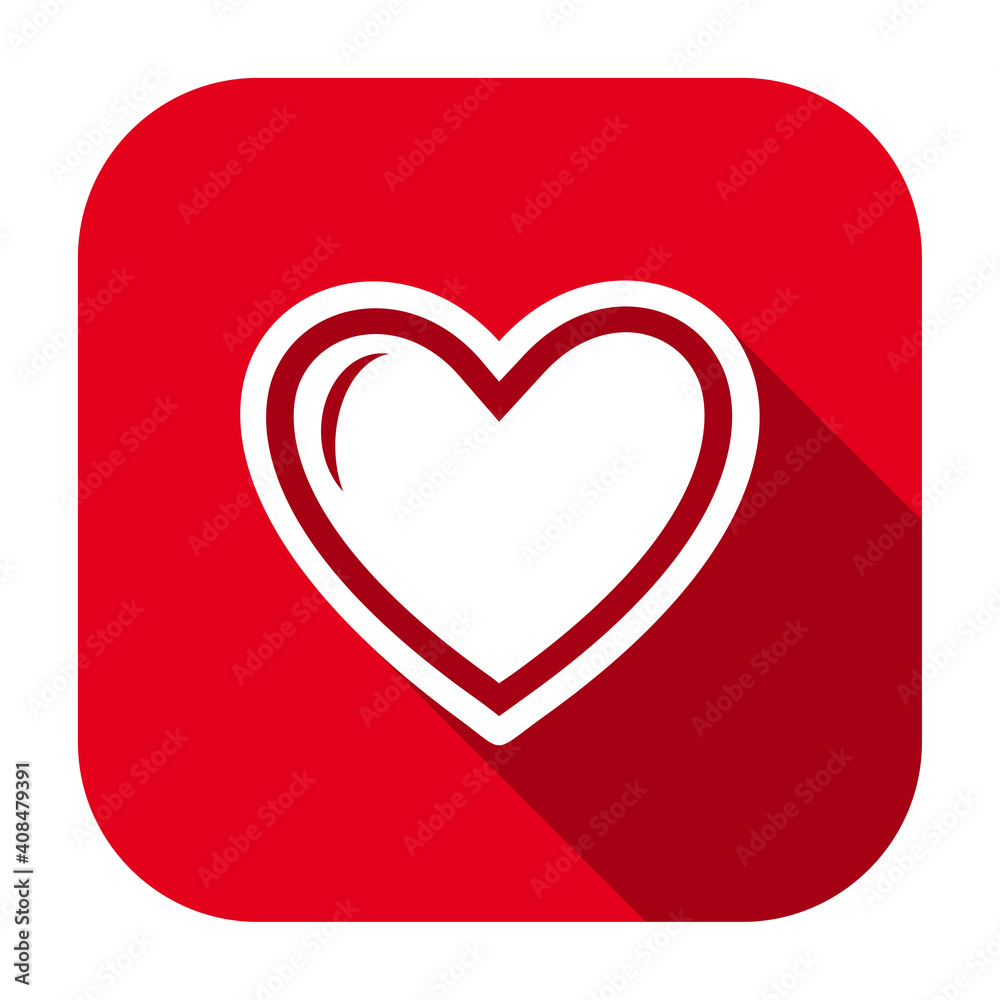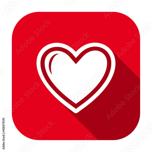 The watermark will not be included on Sticker.: Red flat rounded square heart with outline icon, button with long shadow isolated on a white backgro