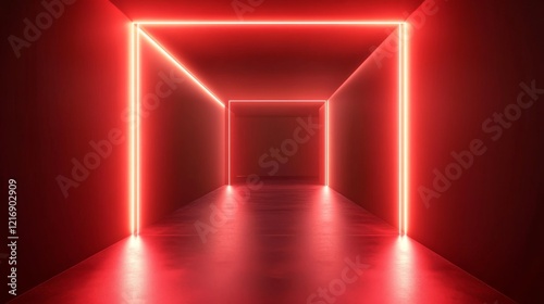 The watermark will not be included on Sticker.: Red virtual abstract space tunnel with neon line lights, spectrum of vibrant colors creating a laser