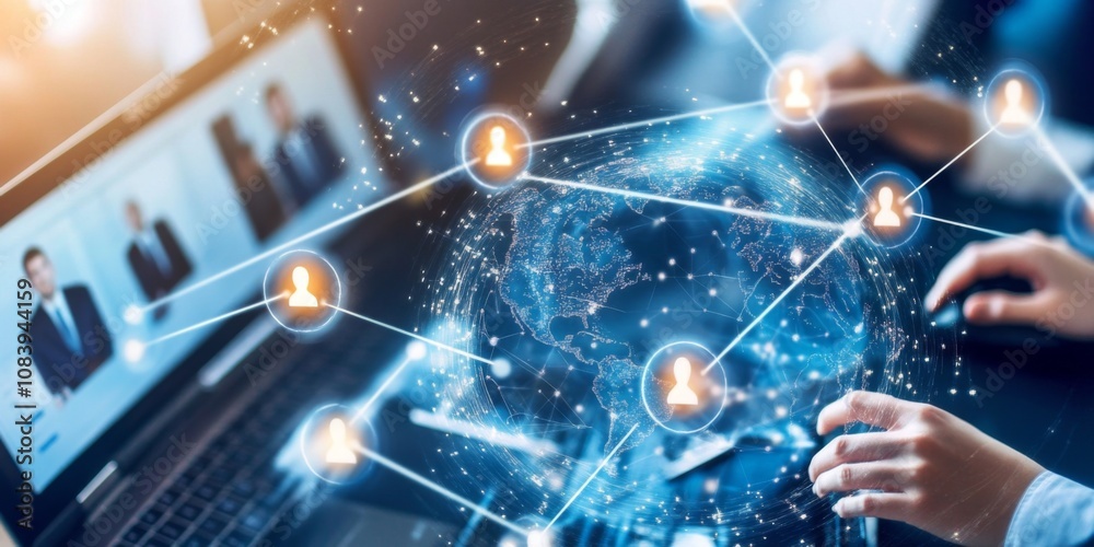 The watermark will not be included on Sticker.: Remote work collaboration : teams from different time zones collaborating in virtual meetings