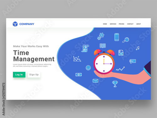 Sticker responsive landing page design for time management concept with a hand holding alarm clock for perfo