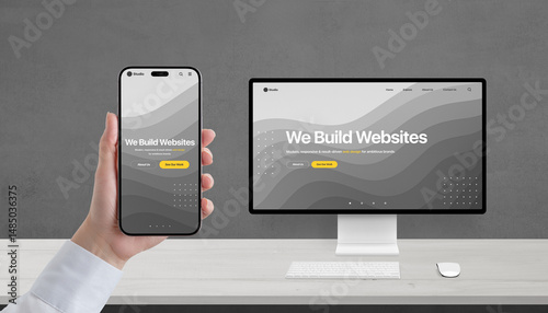 Responsive web design concept on phone and computer, studio portfolio page with 'we build websites' Sticker