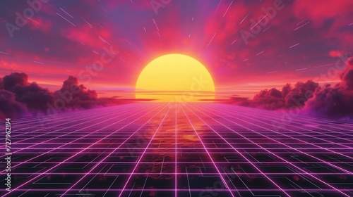 Retro futuristic synthwave style background with neon grids and sunsetSticker