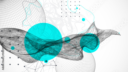Sticker science fiction background. abstract image of wireframe wave and sphere with plexus effect.