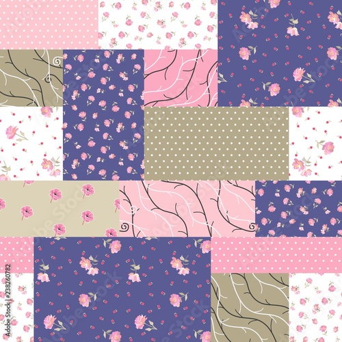 Seamless patchwork pattern from different patches with pink flowers, branches and polka dot ornamentSticker