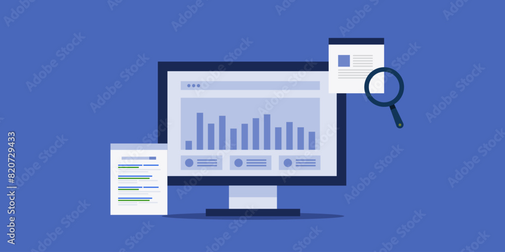 Seo analytics report, internet traffic and website conversion graph, data research on screen, vectorSticker