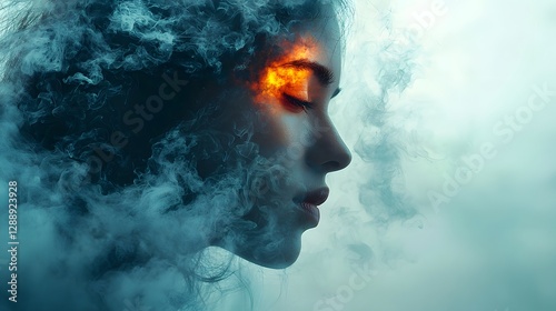The watermark will not be included on Sticker.: Serene glowing composite portrait with flowing ink patterns symbolizing and fluid expression