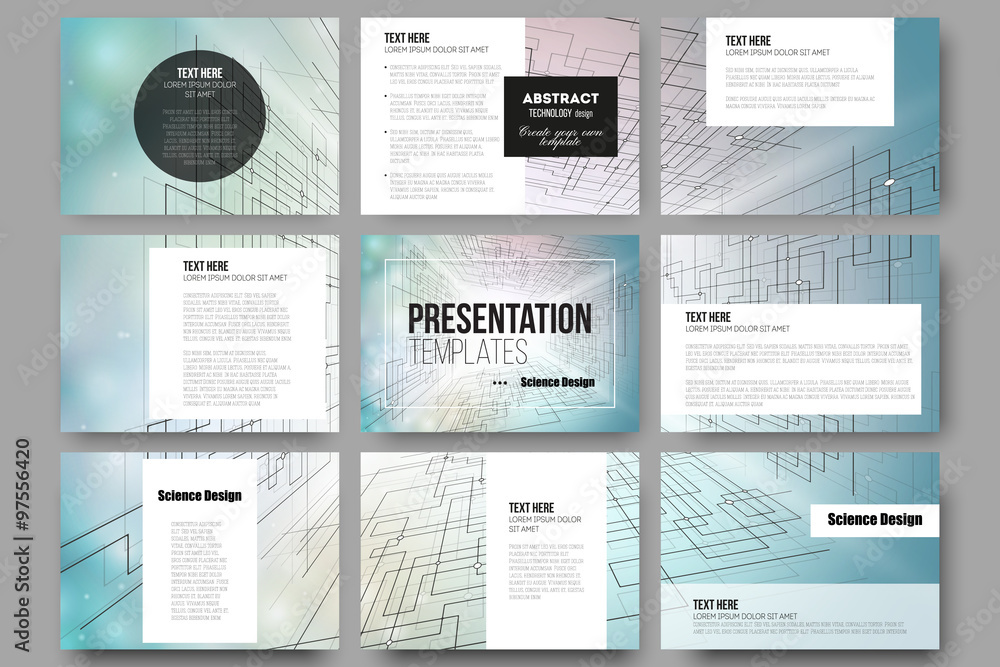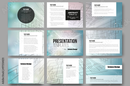 The watermark will not be included on Sticker.: Set of 9 templates for presentation slides - abstract vector background, digital technologies, cyber