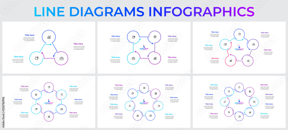 The watermark will not be included on Sticker.: Set of line infographic circles elements and arrows - vector cycle diagrams with 3, 4, 5, 6, 7 and 8