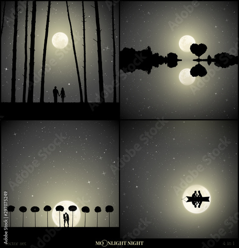 The watermark will not be included on Sticker.: Set of vector illustrations with silhouettes of people in park on moonlit night - lovers in forest be