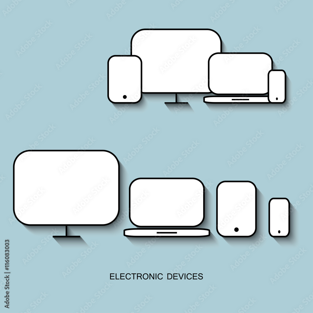 Set with light displays computer notebook tablet and phone on a light blue backgroundSticker