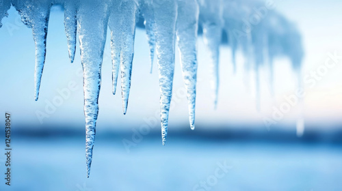 Sticker sharp icicles hanging from a frozen waterfall create a stunning display against a softly blurred bac