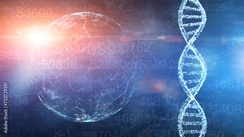 Sticker : Shiny digital cyber space sphere with dna chain and random digits illustration background -
