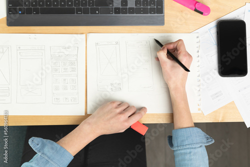 The watermark will not be included on Sticker.: Sketch of wireframe for website - women designer working on a mobile application, drawing on paper -