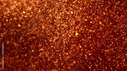 Sticker slowly falling golden particles in red fluid. gold dust particles and bokeh move slowly in red liqui