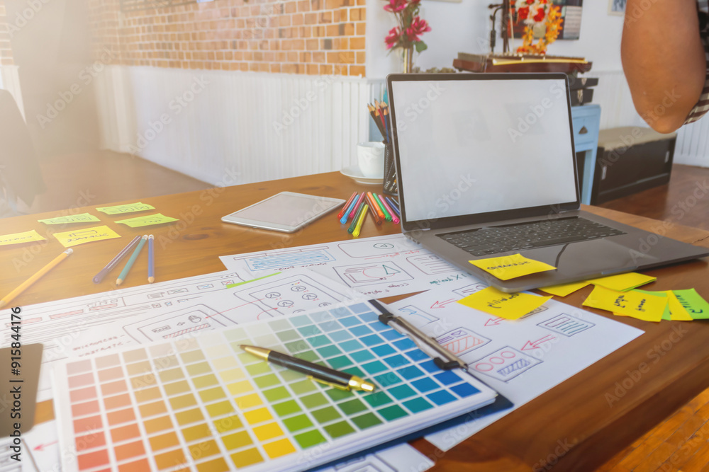 Smooth focus, group of web designers are working together to develop mobile responsive website with Sticker