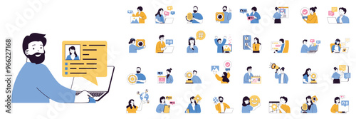 The watermark will not be included on Sticker.: Social network concept mega set with character scenes in flat design for web - bundle situations with