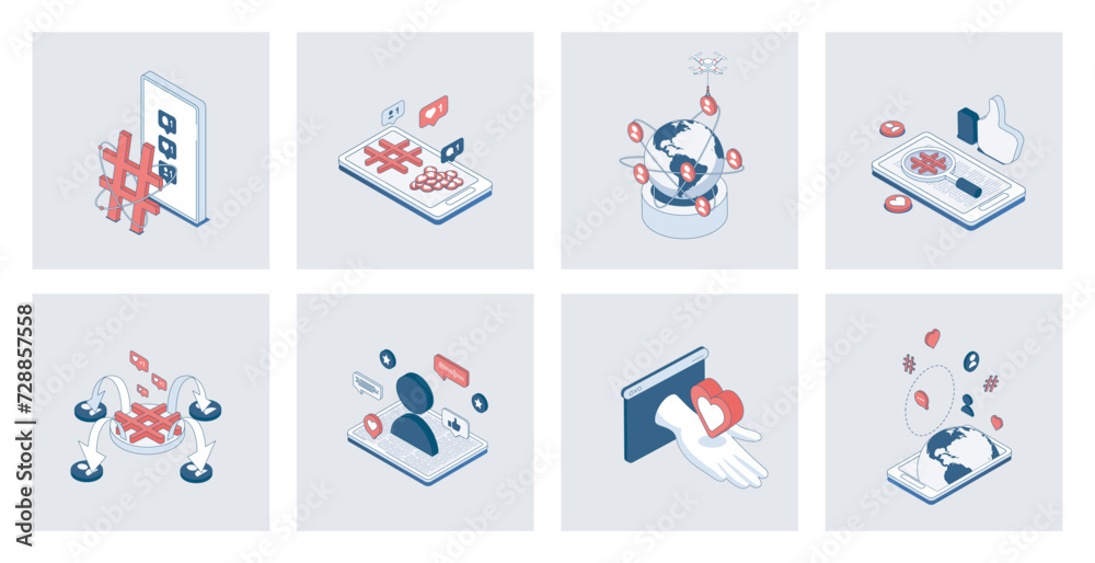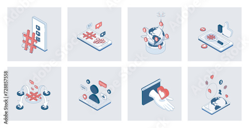 The watermark will not be included on Sticker.: Social network concept of isometric icons in 3d isometry design for web - online communication and in